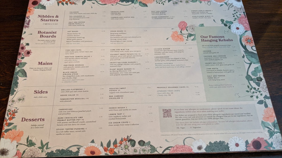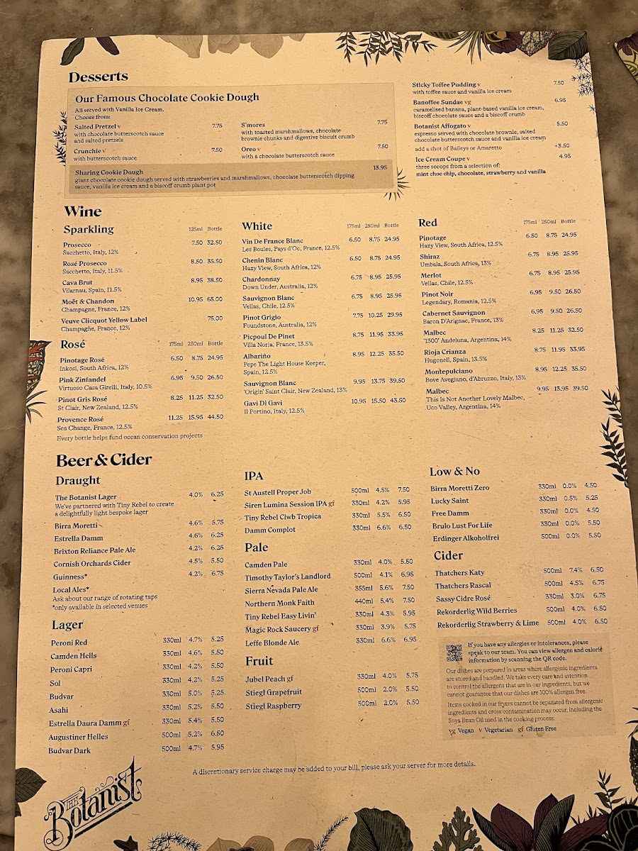 This menu offers a diverse selection of drinks and dining options suited to various occasions, including casual meals, coffee breaks, and evening visits. The beverage choices feature a range of pale ales and fruit-flavored drinks alongside creatively named floral-inspired cocktails. Customers can find beers such as Camden Pale, Timothy Taylor's Landlord, Sierra Nevada Pale Ale, Northern Monk Faith, Tiny Rebel Easy Livin, Magic Rock Saucery, and Leffe Blonde Ale.